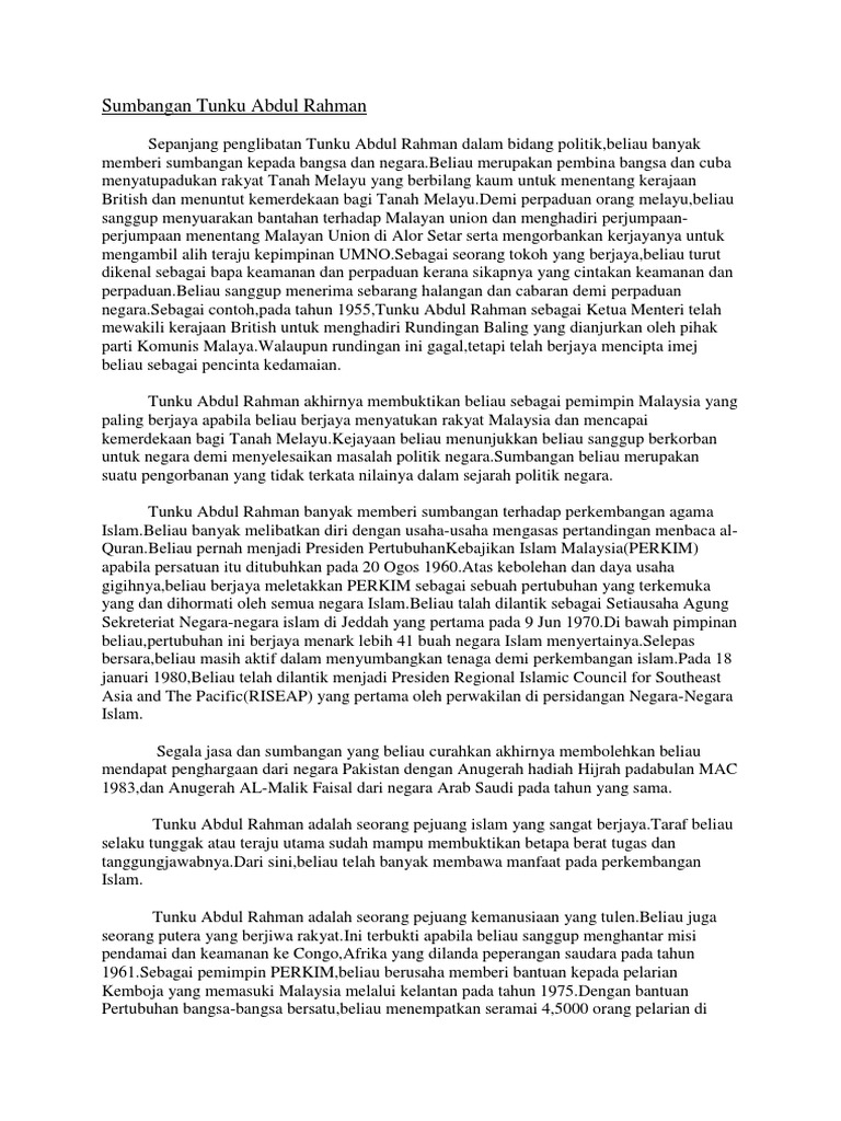 Peranan tunku abdul rahman putra dalam usaha mencapai kemerdekaan negara amat penting. Tunku abdul rahman was born on february 8, 1903, in alor setar, kedah, malaysia. Inilah yang dikatakan sebagai punca. This position was fully supported by tar/umno. Tunku abdul rahman, the gregarious noble who led in the founding of malaysia and who was for 13 years its first prime minister after it became independent from britain in 1957, died yesterday in general hospital in kuala lumpur.