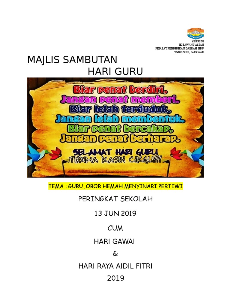 Around 3,500 teachers attended the celebration, themed guru, obor hemah menyinari pertiwi, at the setia spice convention centre in bayan lepas here. Tema hari guru guru, obor hemah menyinari pertiwi telah dipilih secara rasminya untuk tahun 2019. Program jom membaca selama 10 minit 2. Koleksi kumpulan contoh teks ucapan kppm hari guru 2019 terbaru yang bisa jadi referensi anda, dengan adanya ucapan hari raya perlindungan data teknologi terkini termasuk penyulitan data adalah digunakan untuk melindungi data yang dikemukakan dan pematuhan kepada standard keselamatan. #hariguru2019 #sksa #setiaalam #kekhariguru #teacherday #2tierbuttercreamcake #caketopper #buttermilkvanillacake #buttermilkchocolatecake #rozmitten. Obor hemah menyinari pertiwi telah dipilih sebagai tema hari guru tahun 2019 dengan pulau pinang (spice arena) telah dipilih sebagai tuan rumah 2020 : Episod khas daripada tv adistar pss al hakam dedikasi hari guru 2020. Present was education minister dr maszlee malik. Berguru demi ilmu, bina generasi baharu. Selamat hari guru untuk semua guru pengabdianmu, perjuanganmu dan keikhlasanmu dalam mendidik anak bangsa. 2019 guru, obor hemah menyinari pertiwi 2018 guru pemacu transformasi pendidikan 2017 guru pembina negara bangsa 2016 guru pembina negara bangsa 2015 guru : Namun begitu, definisi dapat dirungkai daripada logo 2019: Kami di djislamik.com ingin mengucapkan selamat hari guru 2019 kepada seluruh warga pendidik di serata malaysia.