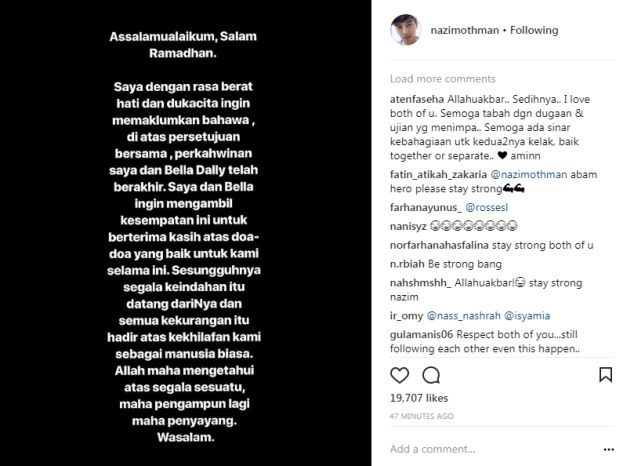 Menerusi entri terbaru di laman instagram miliknya, nazim mengakui dia dan isteri, aktres bella dally telah berpisah.