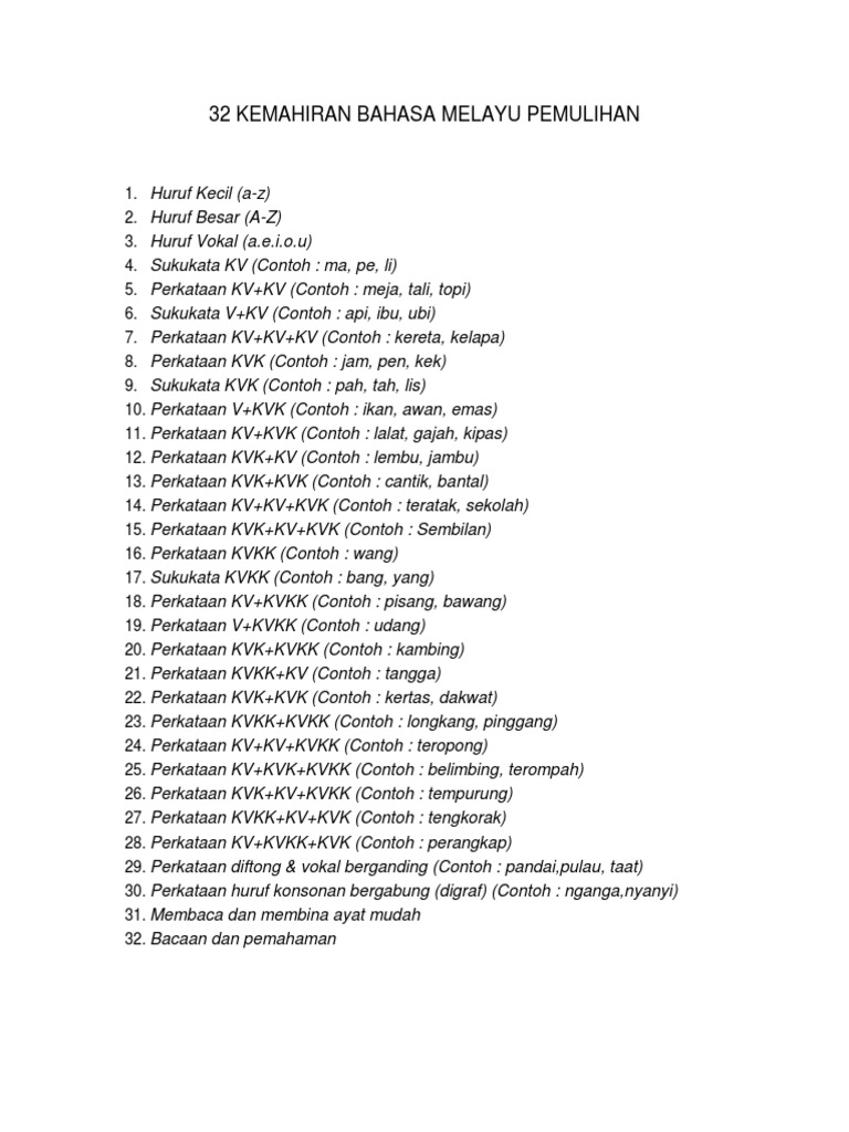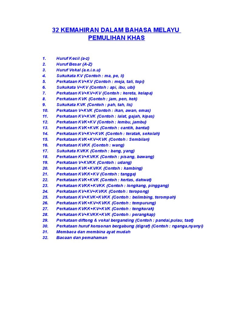 Senarai 32 Kemahiran Pemulihan Bahasa Melayu from imgv2-1-f.scribdassets.com Kelas pemulihan bahasa melayu cikgu chia kemahiran 3 ulang kaji huruf besar. Nama huruf kecil kemahiran 2 : (a) mendengar dan memahami pertuturan dan siaran yang terdapat dalam kehidupan. Melalui teknologi maklumat dan komunikasi meningkatkan tahap motivasi dan. Set ujian program pemulihan khas surat makluman pelaksanaan instrumen penentu penguasaan membaca dan menulis (ipp2m) dan. Buku ini mengandungi 32 kemahiran asas bahasa melayu program pemulihan khas dan ditambah satu lagi kemahiran prabacaan dan pratulisan. Kemahiran ini terdiri daripada 32 set kemahiran bahasa melayu program pemulihan khas. Nama huruf besar lembaran kerja kem.