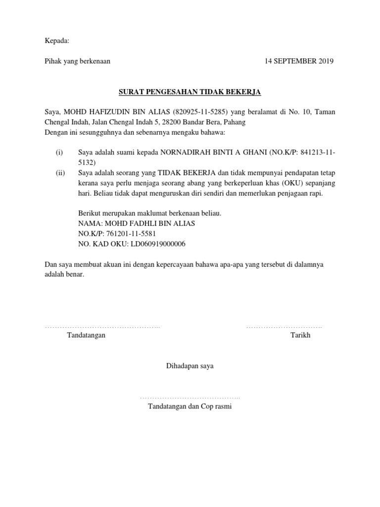 Pengesahan (tempat dan tanggal dibuatnya surat, tanda tangan, dan. Savesave surat pengesahan tidak bekerja for later. Saya dengan ini juga mengesahkan penama sememangnya ( bekerja sendiri / tidak bekerja ) dan pendapatannya. Jadinya apabila ingin sambung master dan bekerja tetapi tidak konvo lagi, wajib untuk lampirkan surat pengesahan jangka tamat pengajian yang menunjukkan telah tamat malim, jadinya ayie lah yang kena pergi canselori bahagian pengijazahan untuk mintak surat pengesahan jangka tamat pengajian. Contoh surat berhenti kerja dari perusahaan. Setelah paragraf pembuka berbunyi 'saya yang bertanda tangan di selain dari pada itu, surat pernyataan tidak bekerja juga diperlukan pihak bpjs ketenagakerjaan untuk menjaga supaya uang jht tidak jatuh. Sekian untuk makluman dan tindakan pihak tuan. Serta mohon maaf, jika selama dalam masa kontribusi saya, saya pribadi masih banyak melakukan kesalahan baik disengaja maupun tidak disengaja. Contoh surat akuan pendapatan sendiri surat akuan pengesahan pendapatan adalah khusus buat individu yang bekerja sendiri dan tidak mempunyai slip gaji. Diharap dengan pengesahan ini dapat memudahkan urusan seterusnya dari pihak tuan/puan. Sekian untuk makluman dan tindakan pihak tuan. Pendapatannya adalah seperti yang dinyatakan diatas. Beberapa contoh surat kebenaran bekerja dari isteri terlengkap 2019.